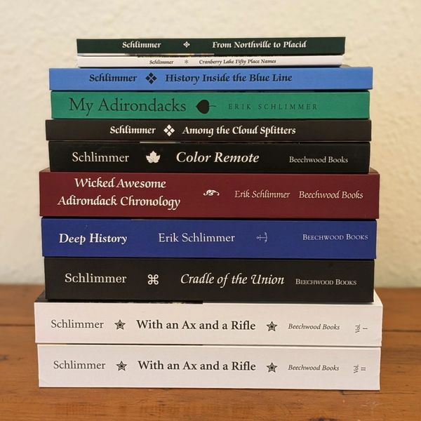 All ten titles at a package deal price – Wicked Awesome Adirondack Chronology, Cranberry Lake Fifty Place Names, With an Ax and a Rifle, Deep History, From Northville to Placid, Color Remote, Cradle of the Union, Among the Cloud Splitters, My Adirondacks, and History Inside the Blue Line plus the cool Adirondack settlement poster